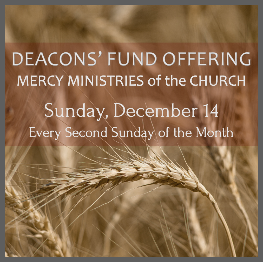 DEACONS’ FUND OFFERING will be collected for the Mercy Ministries of the Church during the Worship Service. Deacons’ Fund Offering is collected every second Sunday of each month, *unless otherwise noted.
