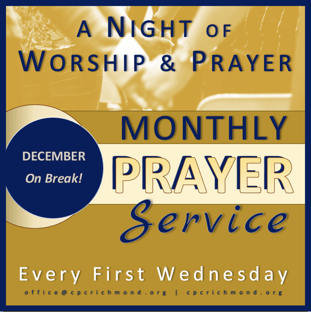 MONTHLY PRAYER SERVICE is on DECEMBER BREAK! Our Monthly Prayer Service meets every first (1st) Wednesday of the month at 6:30 PM in the Church Foyer, *unless otherwise noted.