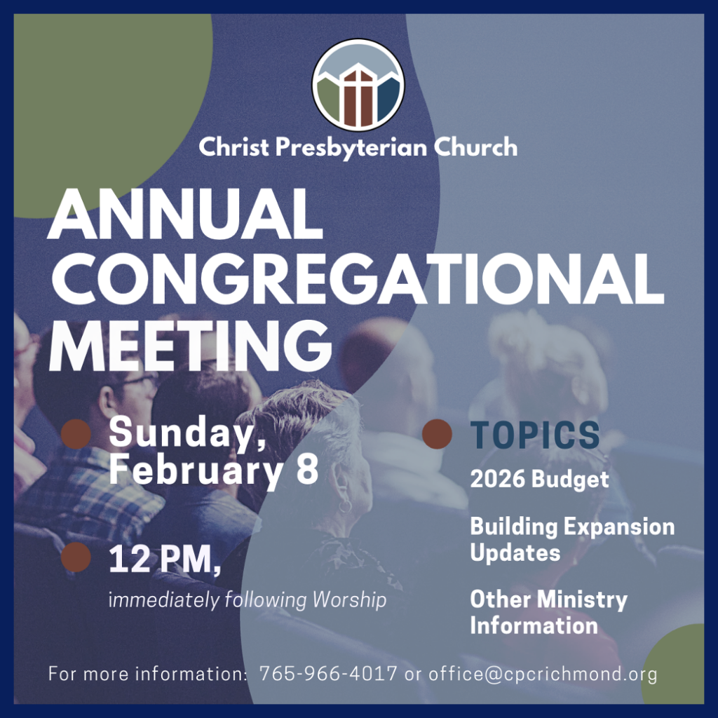 ANNUAL CONGREGATIONAL MEETING 2026 to present the 2026 Budget, Building Expansion Updates, and other Ministry information will be held on Sunday, February 8, 2026, immediately following Worship.