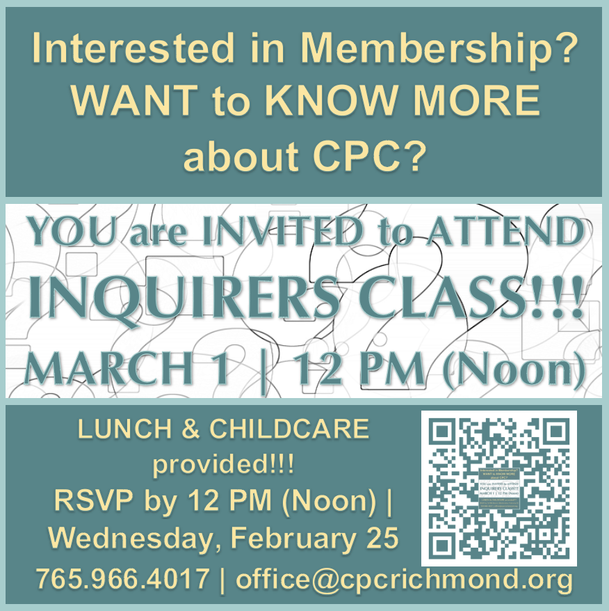 2026 SPRING INQUIRERS CLASS – Interested in Membership? Want to know more about CPC? You are invited to attend the Inquirers Class (in Foyer) on Sunday, March 1, 2026, at 12 PM (Noon)!