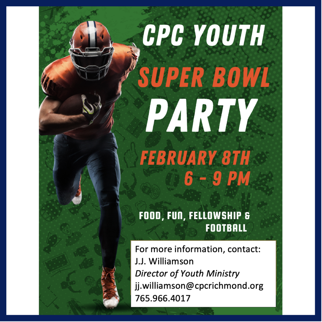 CPC YOUTH SUPER BOWL PARTY 2026 will be Sunday, February 8, 2026, from 6 – 9 PM.