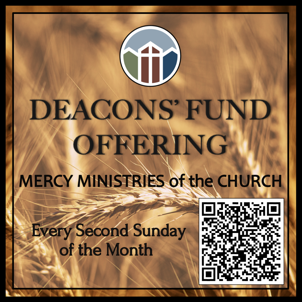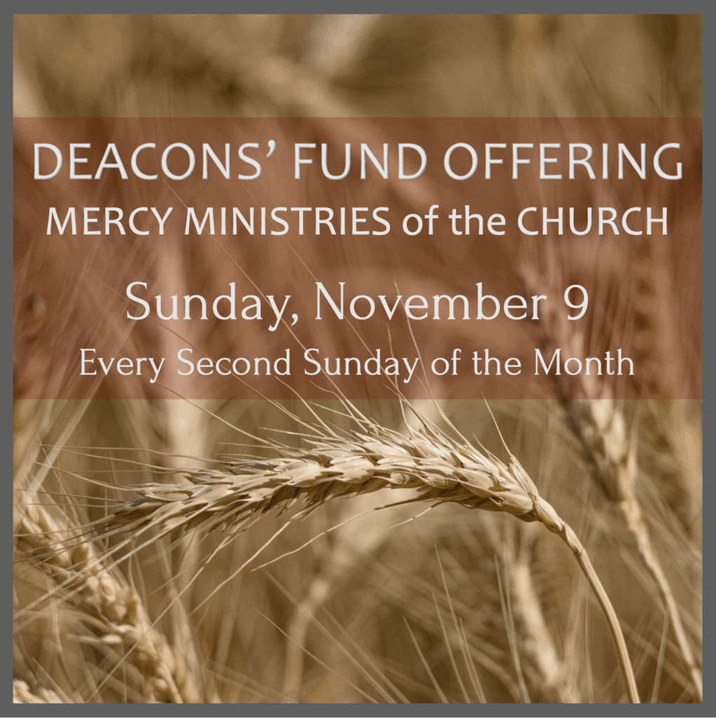 DEACONS’ FUND OFFERING will be collected for the Mercy Ministries of the Church during the Worship Service. Deacons’ Fund Offering is collected every second Sunday of each month, *unless otherwise noted.