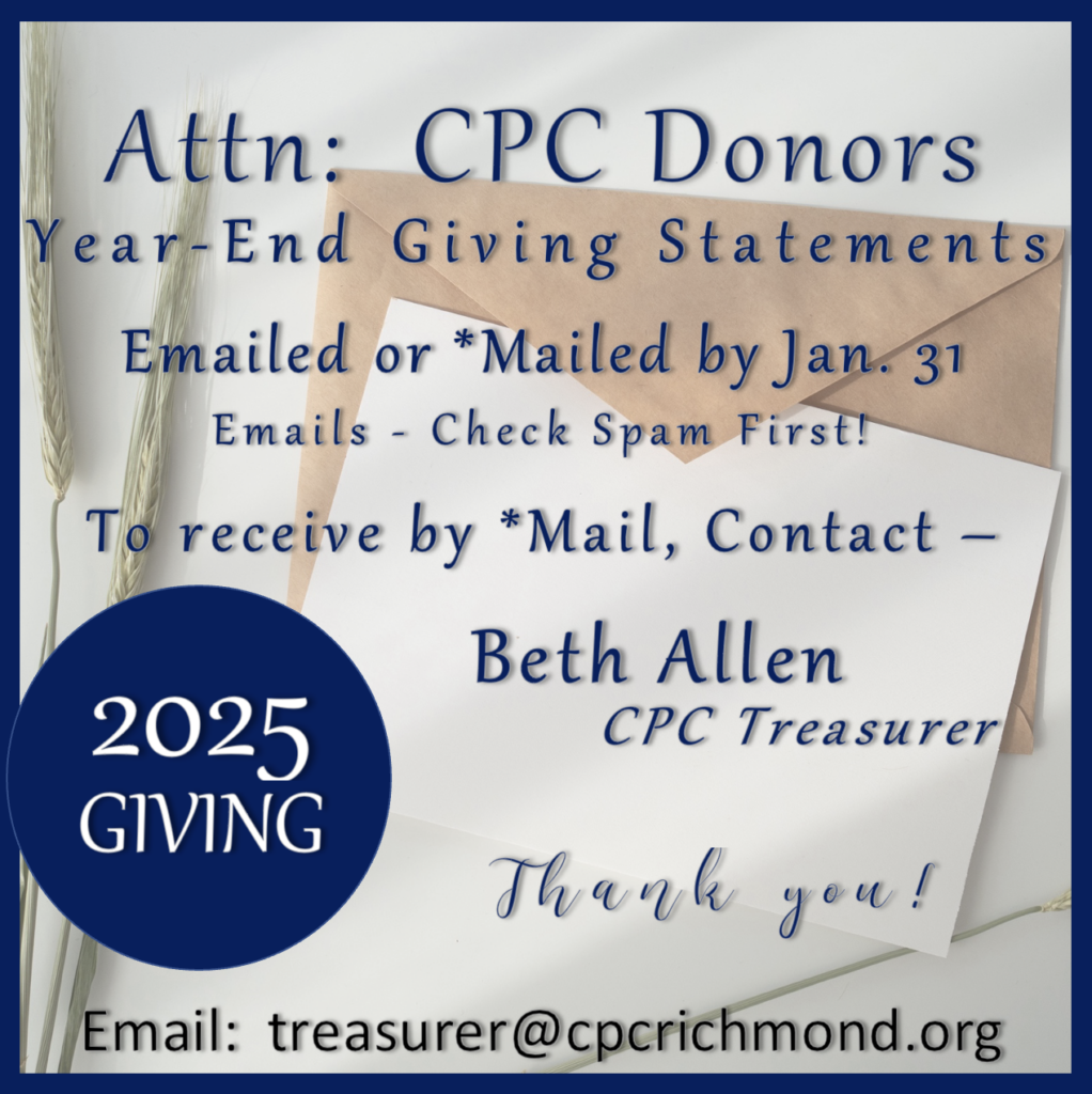 For a copy by *mail, please reach out to Beth Allen, CPC Treasurer, to be sure your contact information is up-to-date and to request a cpy of your statement to be sent out.